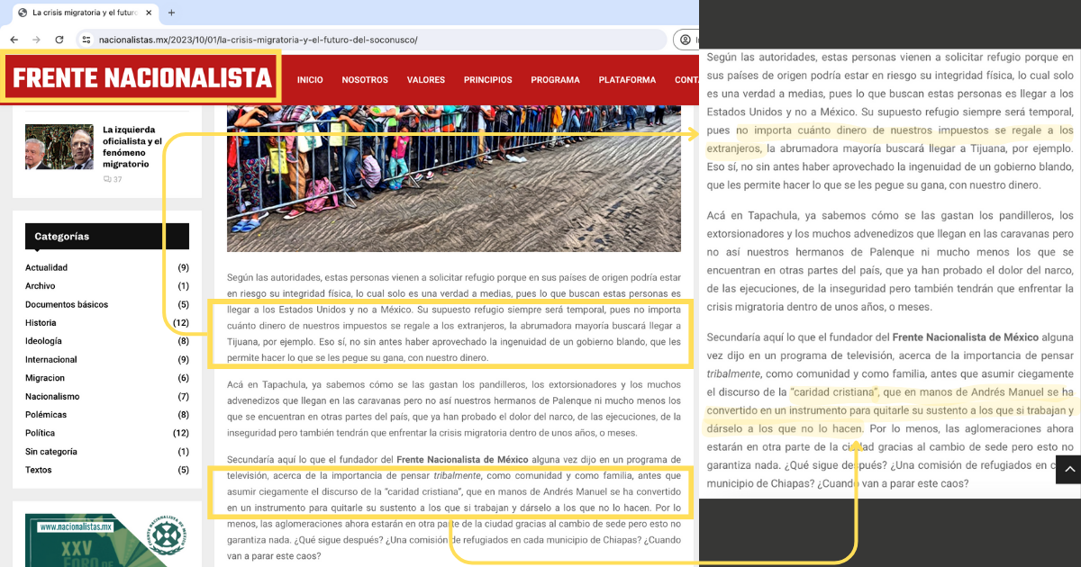 Usando sus perfiles de redes sociales y canales de difusión, organizaciones civiles con ideología nacionalista de extrema derecha comparten desinformación y discurso de odio antiinmigrante y LGBTodiante.