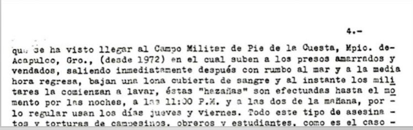 Estos señores, torturadores y asesinos, tienen como cementerio particular los lugares despoblados y el mar; y para adentrarse a este último, usan helicópteros y un avión panzón como sapo de color gris, el que se ha visto llegar al Campo Militar Pie de la Cuesta, Mpio. de Acapulco, Gro., desde 1972, en el cual suben a los presos amarrados y vendados, saliendo inmediatamente después con rumbo al mar y a la media hora regresa, bajan una lona cubierta de sangre y al instante los militares la comienzan a lavar, éstas ‘hazañas’ son efectuadas hasta el momento por las noches, a las 11:00 P.M. y a las dos de la mañana, por lo regular usan los días jueves y viernes.