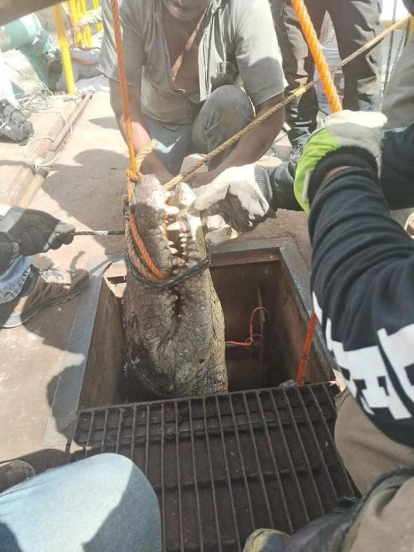 Rescatan cocodrilo atorado en el acueducto de Victoria